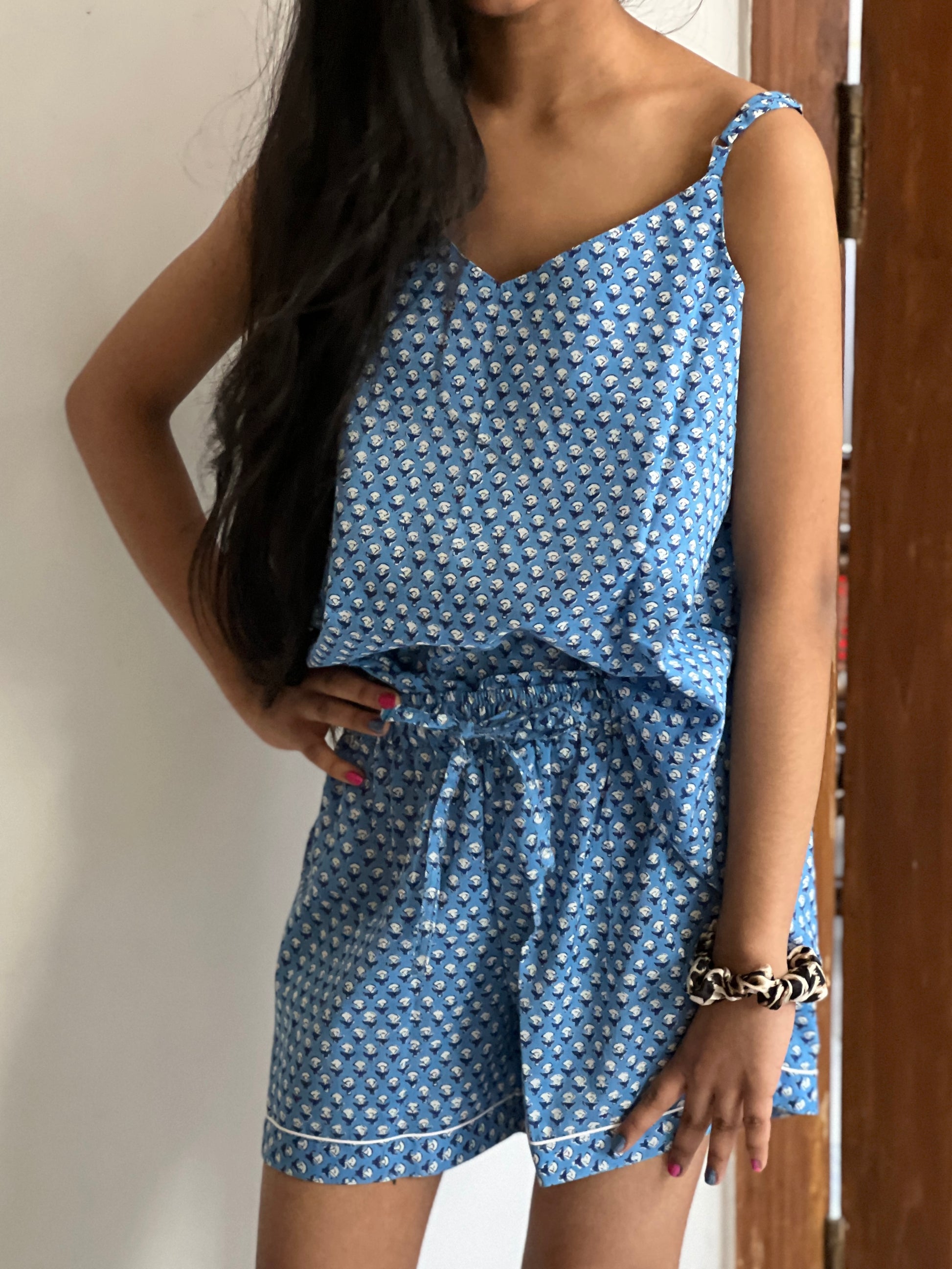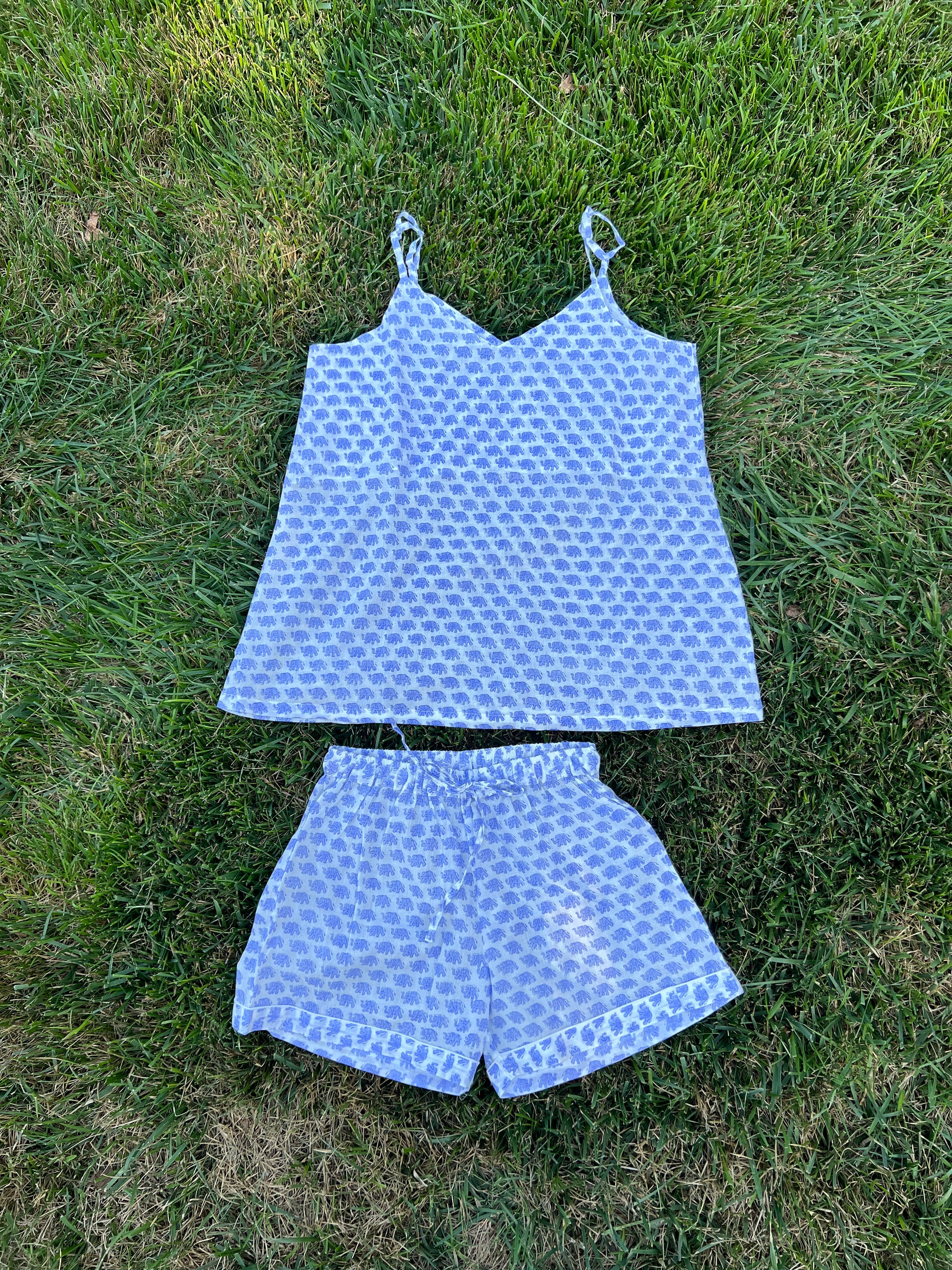 Block print flowers on the softest, corn flower blue cotton! The top has adjustable straps and is a loose and lazy cut for utmost comfort. White piping and a drawstring waist finishes the shorts. We offer three sizes, small, medium and large which are sized as expected. We offer this lounge set in other fun prints. Machine washable, cool and fun, enjoy!
