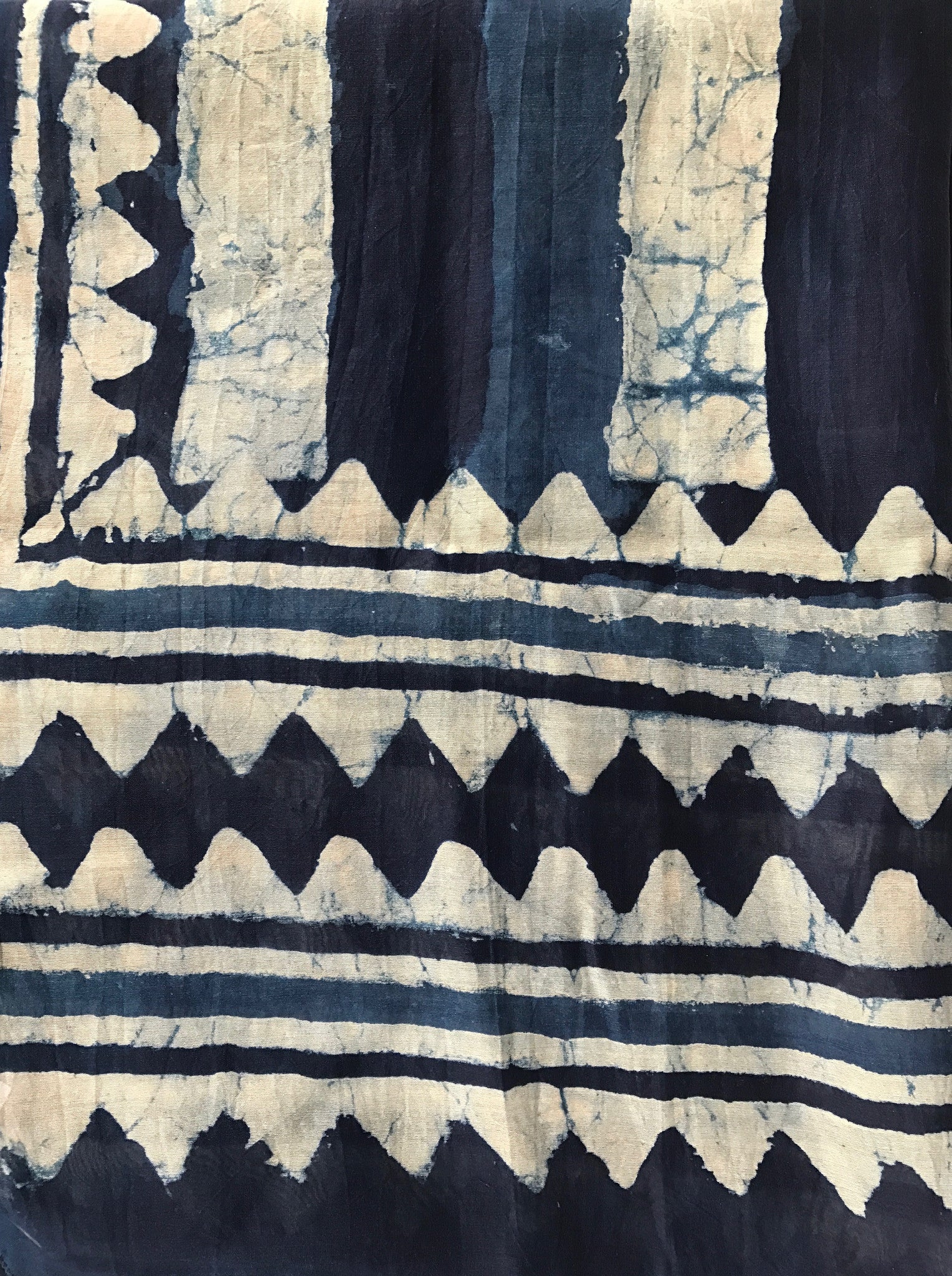 Stripes and Zigzags garland this Indigo blue " Chanderi " sheer stole. Fabulous with jeans or an all white look, the hand crafted Batik gives texture and beauty.