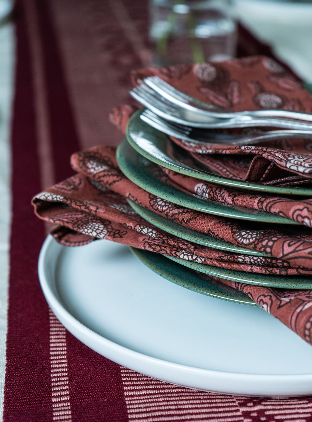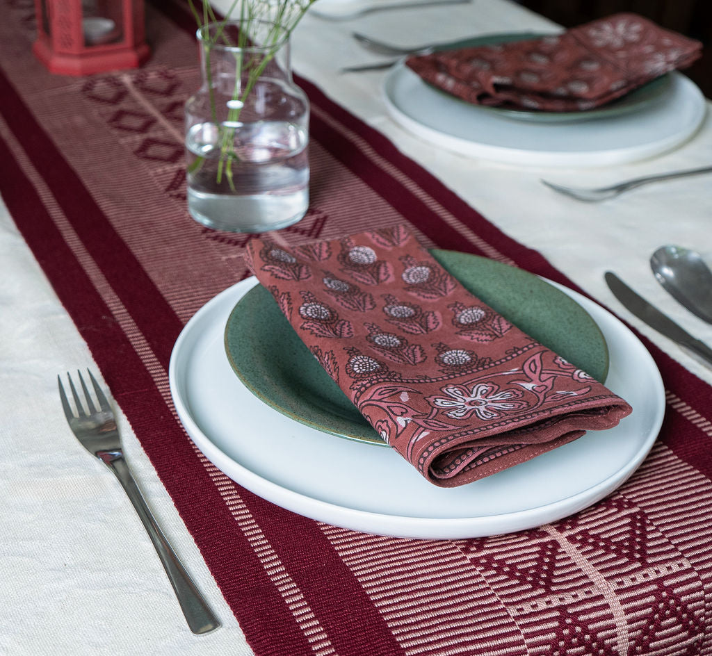 Each napkin is hand block printed using carved wooden blocks, where the block is a masterpiece in itself.