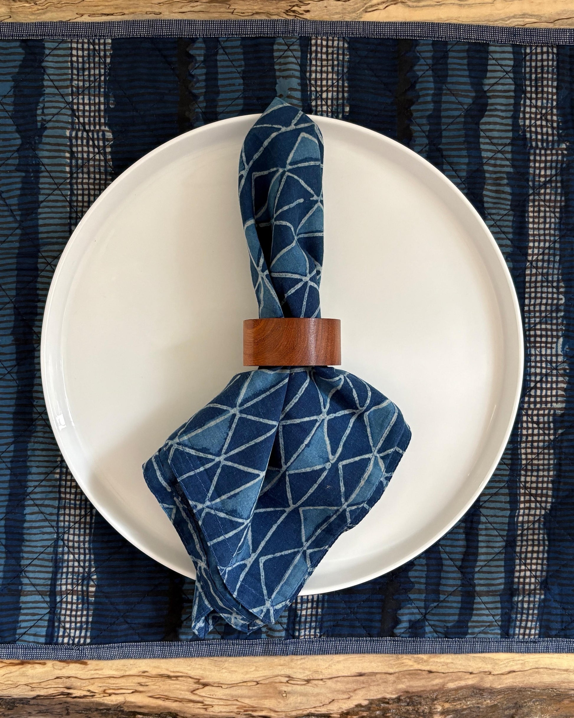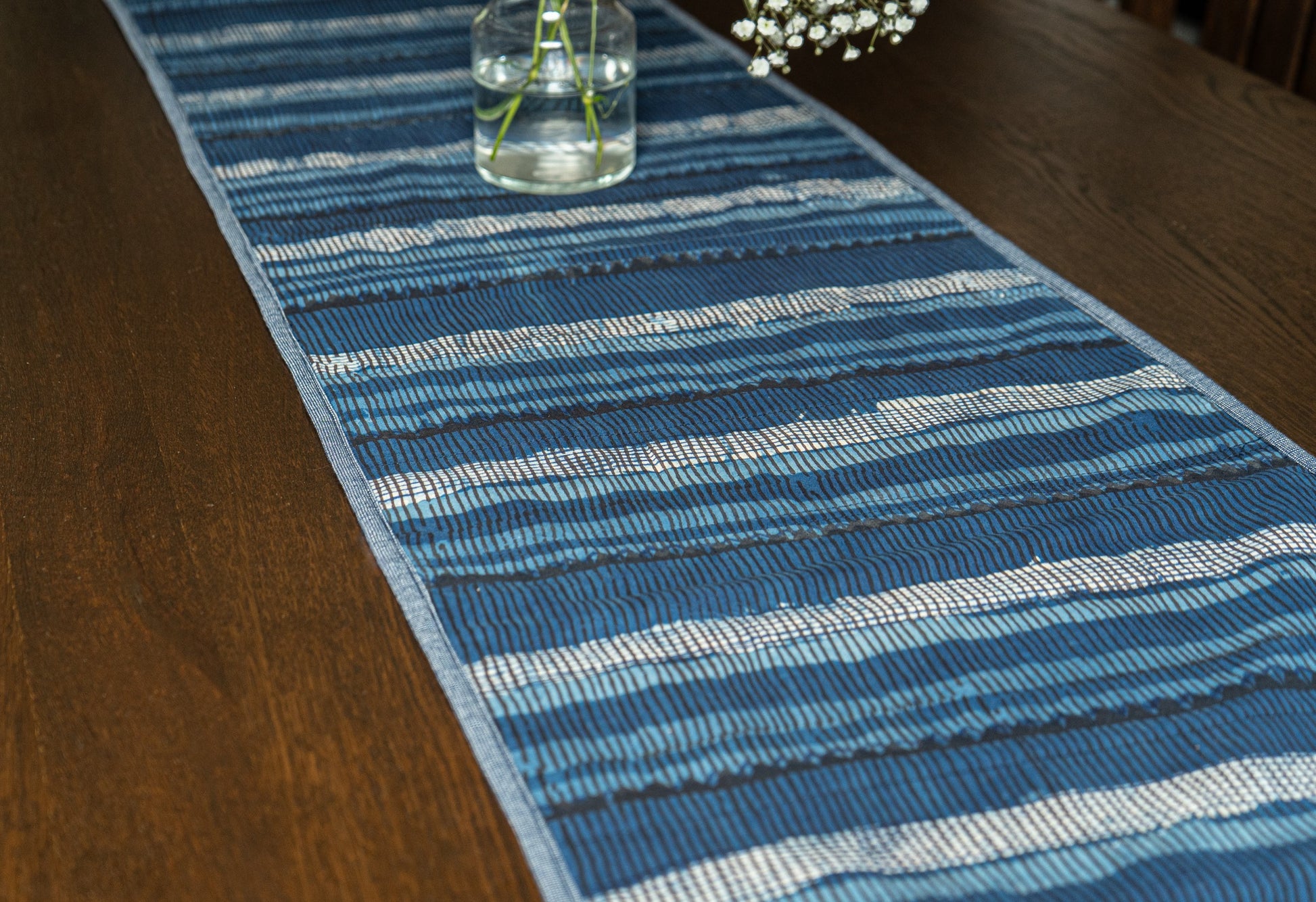 The Blue Note runner is everything you could want….. it is beautifully block printed by hand using indigo dyes, it is generously sized at 88” x 14”, it is quilted with hand woven fabric on the reverse and so can be used on either side. It pairs wonderfully with an assortment of our very popular indigo napkins. We had the best time photographing the table setting using white plates and flowers and indigo everything else. Imperfections are part of this unique handmade piece.
