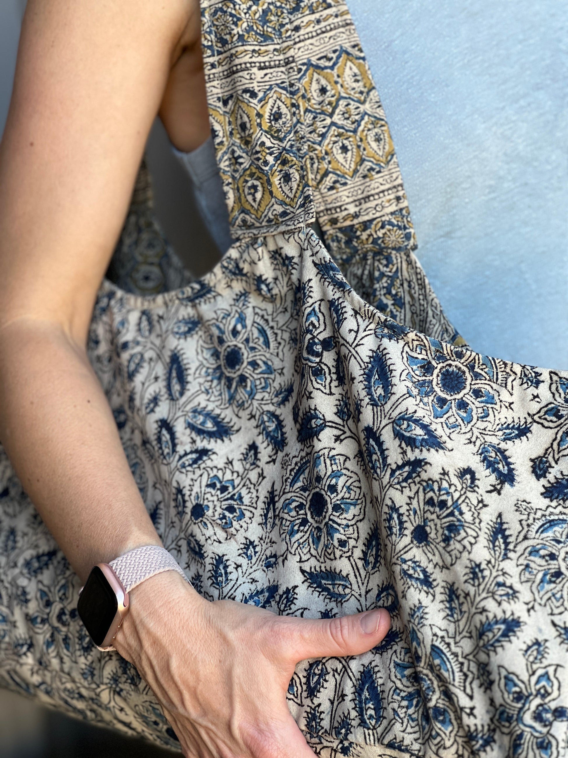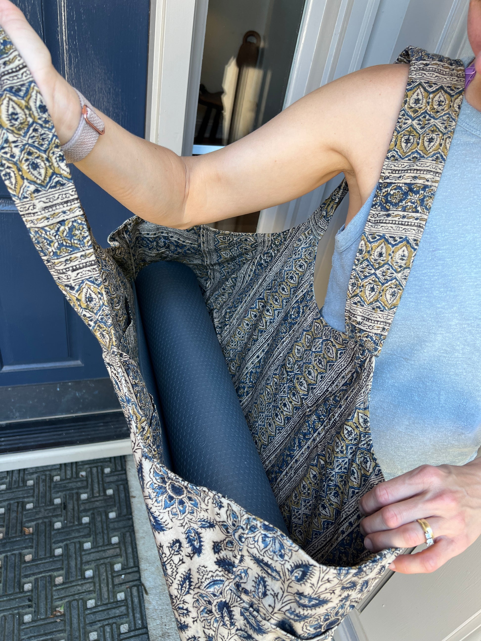 Cotton block print yoga mat bag. Making it to yoga/pilates or just any workout is half the job done towards a fit and happy you! This fabulous bag makes it so much easier. Stash your mat, keys, phone, towel, whatever and head to class. The aesthetic comes from hand block printed canvas and cotton; the color, typical indigo floral print on raw cotton. Coordinating with the mustard/indigo straps and lining. Rolls into a neat pack for storage.